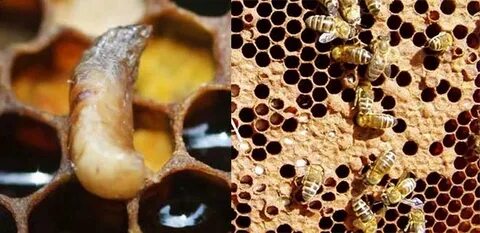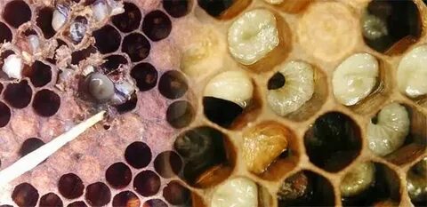 3.Внутри ячеек мертвые личинки, лежащие на спине вдоль ячейки: матовые, дряблые, водянистые. Затем становятся плотными, заполненными зернистой, мутновато-белого цвета жидкостью. Запаха нет.